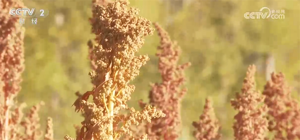 记者来到了青海省海西蒙古族藏族自治州乌兰县的一块藜麦标准化种植示范基地,这里地处柴达木盆地腹地,平均海拔在3000米左右,这里的万亩藜麦已经很成熟。远远望去,成熟的麦穗如同一片火红、金黄、紫红等颜色相间的藜麦海洋,整块田地更宛如一幅天然油画,美不胜收。你们可以看到,成熟的藜麦最高能达到2米多。藜麦成熟后的籽粒对水分十分敏感,遇水2小时就会发芽,失去商业经济价值。而柴达木盆地独特的自然、气候和生态环境能够让藜麦从始至终保持一个干燥的状态,这里也是青海的藜麦最佳种植区。